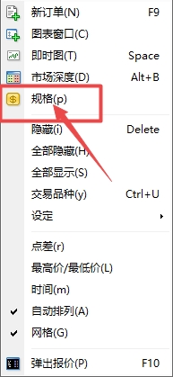 第一步:在交易货币上面点击右键,在弹窗中选择规格进入。